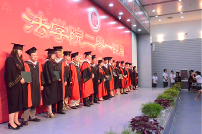 紧接着,刘大炜宣读了关于表彰2014届优秀毕业生的决定,并在之后进行了谢师仪式,毕业生代表纷纷为老师们献花以此来表达内心的感激之情。最后是隆重的学士学位授予仪式,毕业生们相继上台接受授予并与老师们合影留念,随着学士帽的流苏从右边拨向左边,毕业生们在法大的本科生生涯正式画上了圆满的句号。约12:30学位授予仪式正式结束。